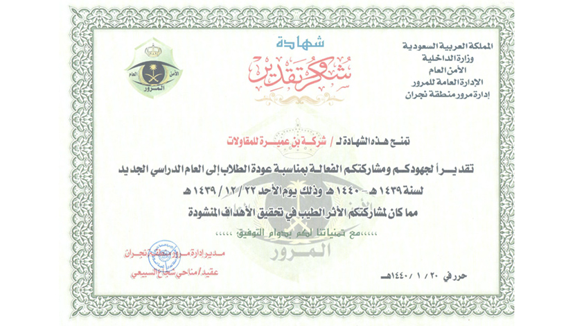 Bin Omairah is HONORARY awarded two Certificates of Appreciation from General Department of Traffic in Najran.